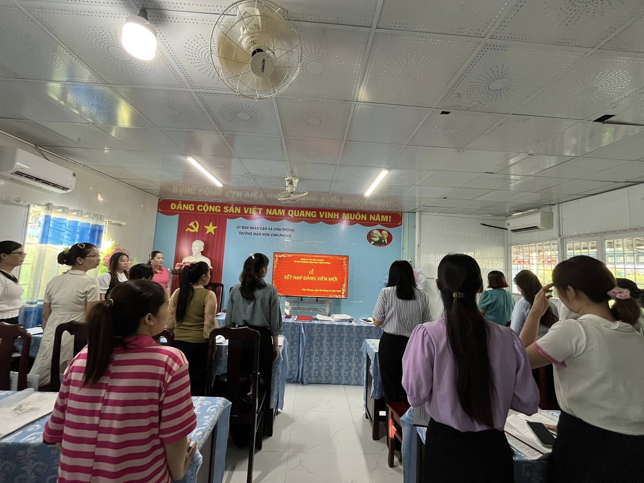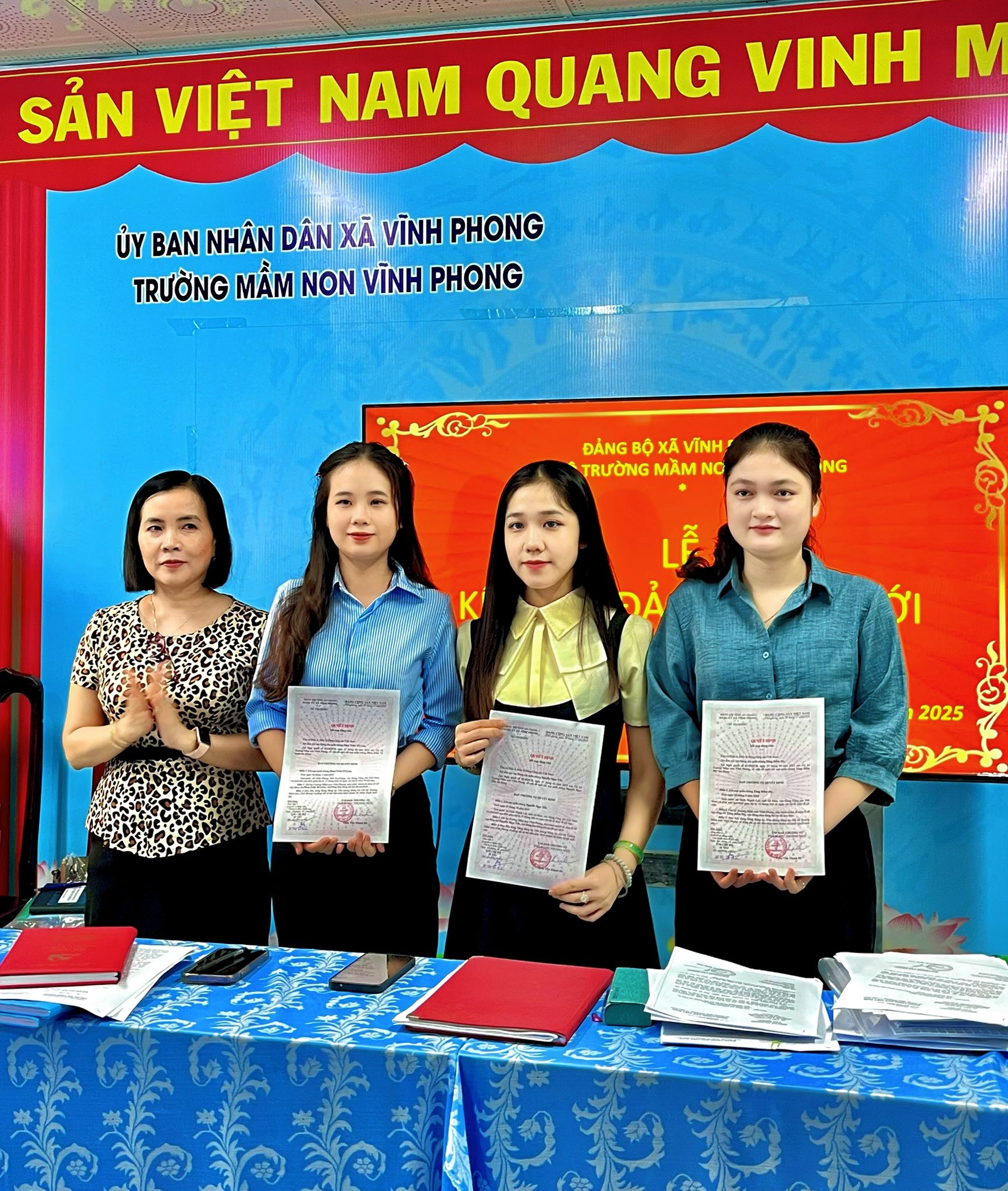Sáng ngày 06/12/2025, Chi bộ Mầm non Vĩnh Phong long trọng tổ chức lễ kết nạp 3 Đảng viên mới. Một dấu mốc đầy tự hào, ghi nhận quá trình phấn đấu bền bỉ của các đồng chí. Buổi lễ diễn ra trang nghiêm, ấm áp và tràn đầy niềm tin vào lực lượng trẻ đầy nhiệt huyết. Xin chúc mừng các đồng chí đã chính thức đứng trong hàng ngũ của Đảng. Mong rằng mỗi người sẽ tiếp tục rèn luyện, giữ vững lý tưởng, góp phần xây dựng Chi bộ ngày càng vững mạnh. Một hành trình mới, trách nhiệm mới – và cũng là niềm tự hào lớn lao.
